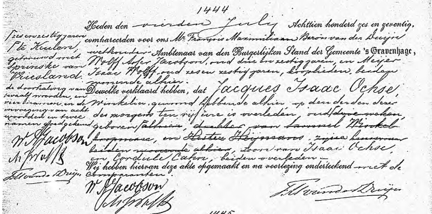 [Sterbeurkunde] 's-Gravenhage 1876/1444, Jacques Isaac Ochse, *1810 Köln, +03.07.1876 Den Haag, Händler, 66 Jahre alt, geboren in Köln, Ehemann von Sprinske van Vriesland, Sohn von Isaak Ochse und Cordule Cahn, beide verstorben, Anzeigende: Wolff Asher Jacobson, 63 Jahre alt, Meyer Isaac Wolff, 66 Jahre alt, kooplieden?, beide hier wohnhaft