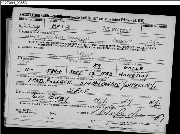 "United States Social Security Death Index," database, FamilySearch (https://familysearch.org/ark:/61903/1:1:JKTG-XX9 : 20 May 2014), Bela Szunyog, Feb 1972; citing U.S. Social Security Administration, Death Master File, database (Alexandria, Virginia: National Technical Information Service, ongoing).