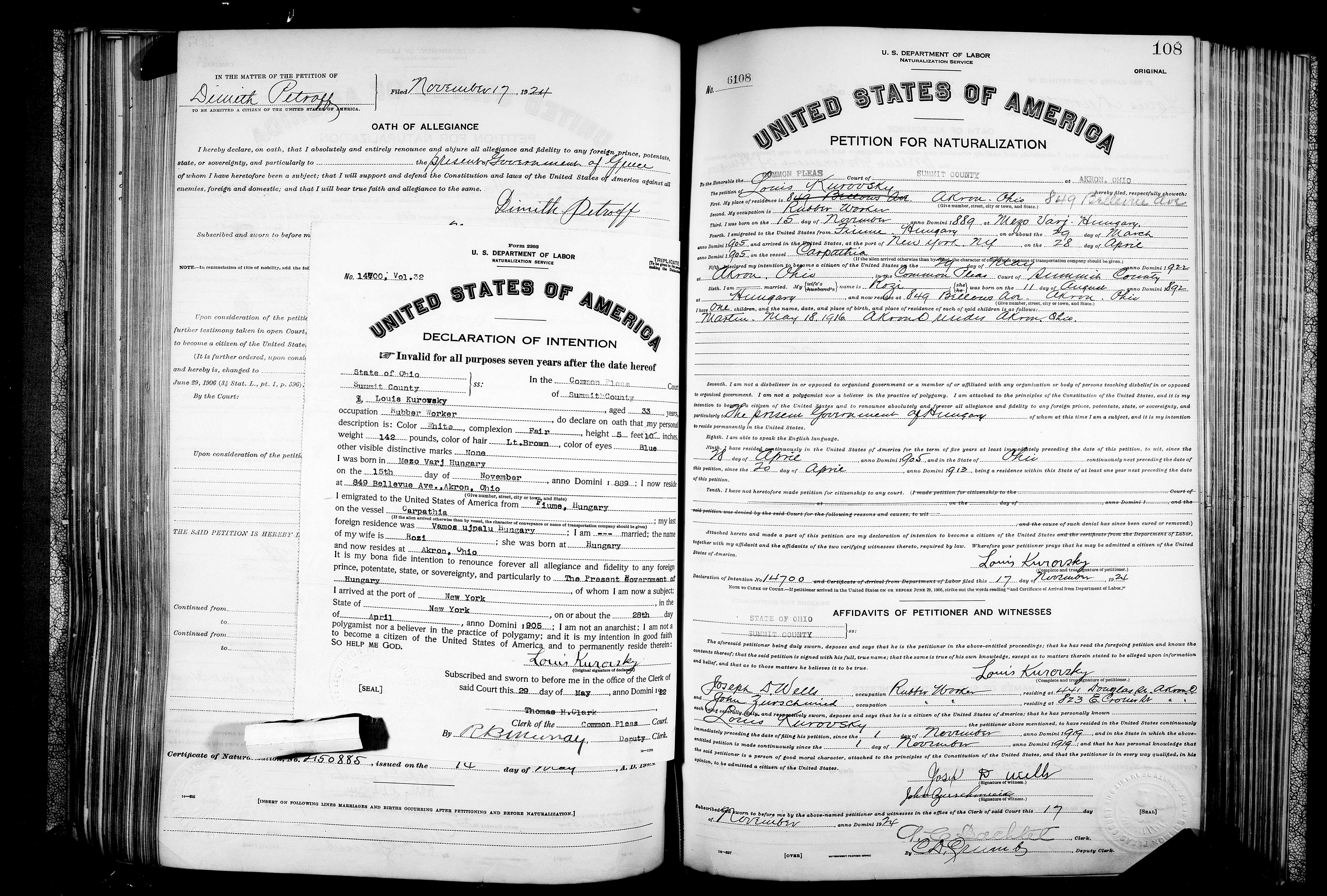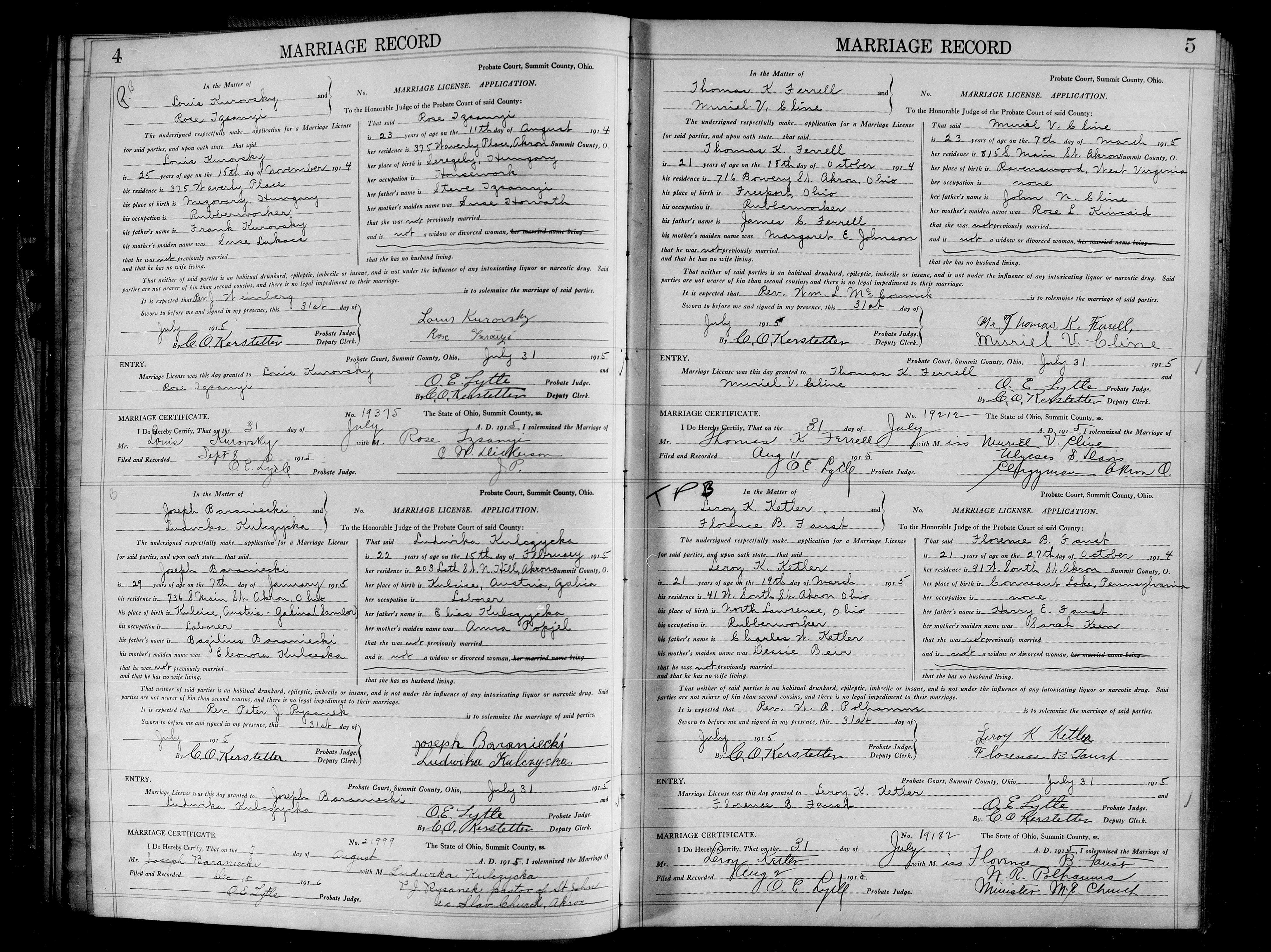 "Ohio, County Marriages, 1789-2013," database with images, FamilySearch (https://familysearch.org/ark:/61903/1:1:XDWR-NY5 : 26 August 2019), Louis Kurovsky and Anna Pap, 14 Jul 1914; citing Marriage, Summit, Ohio, United States, p 385, Franklin County Genealogical & Historical Society, Columbus; FHL microfilm.