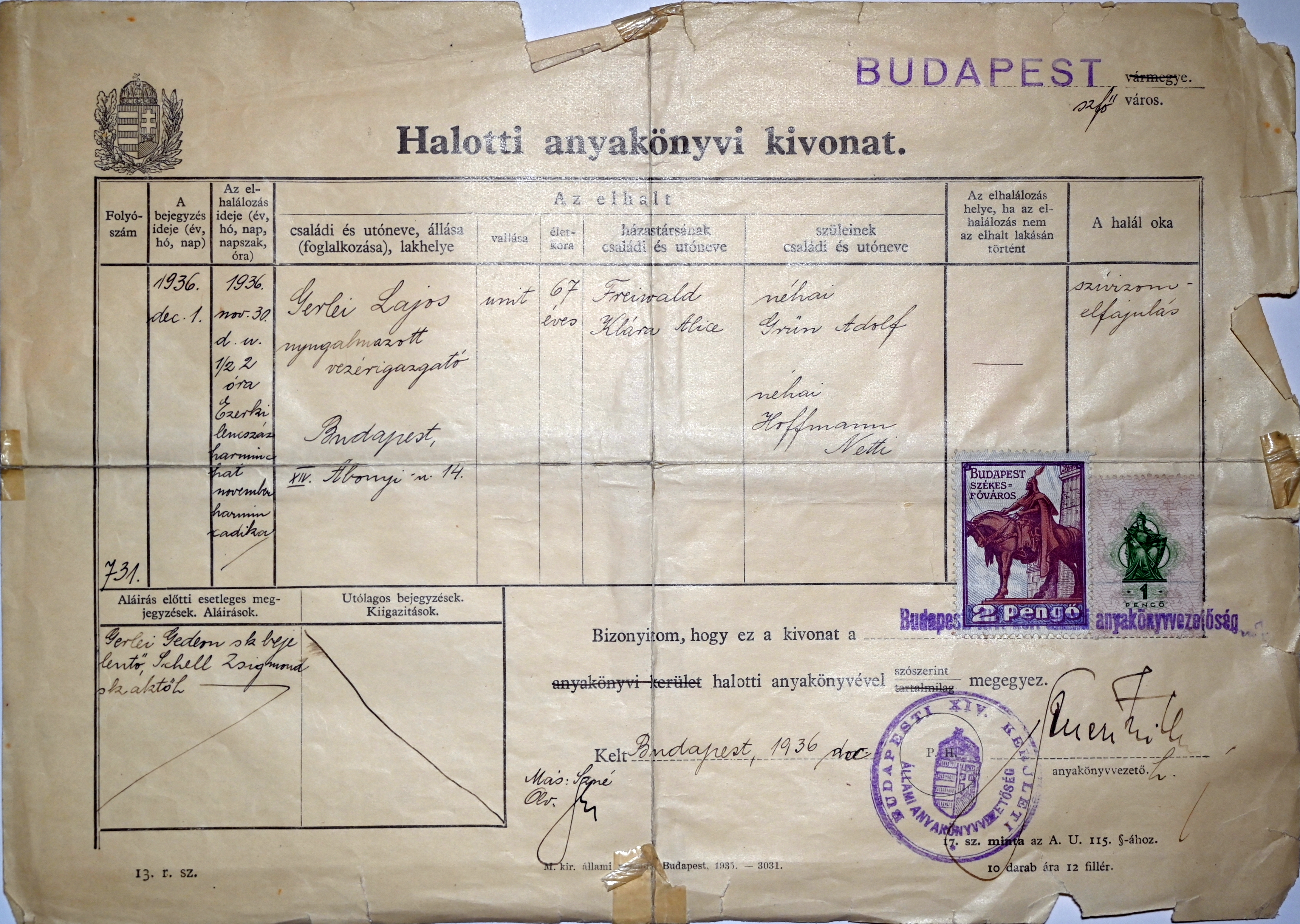 | Death | 1936-11-30 | Budapest, Magyarország | ||
