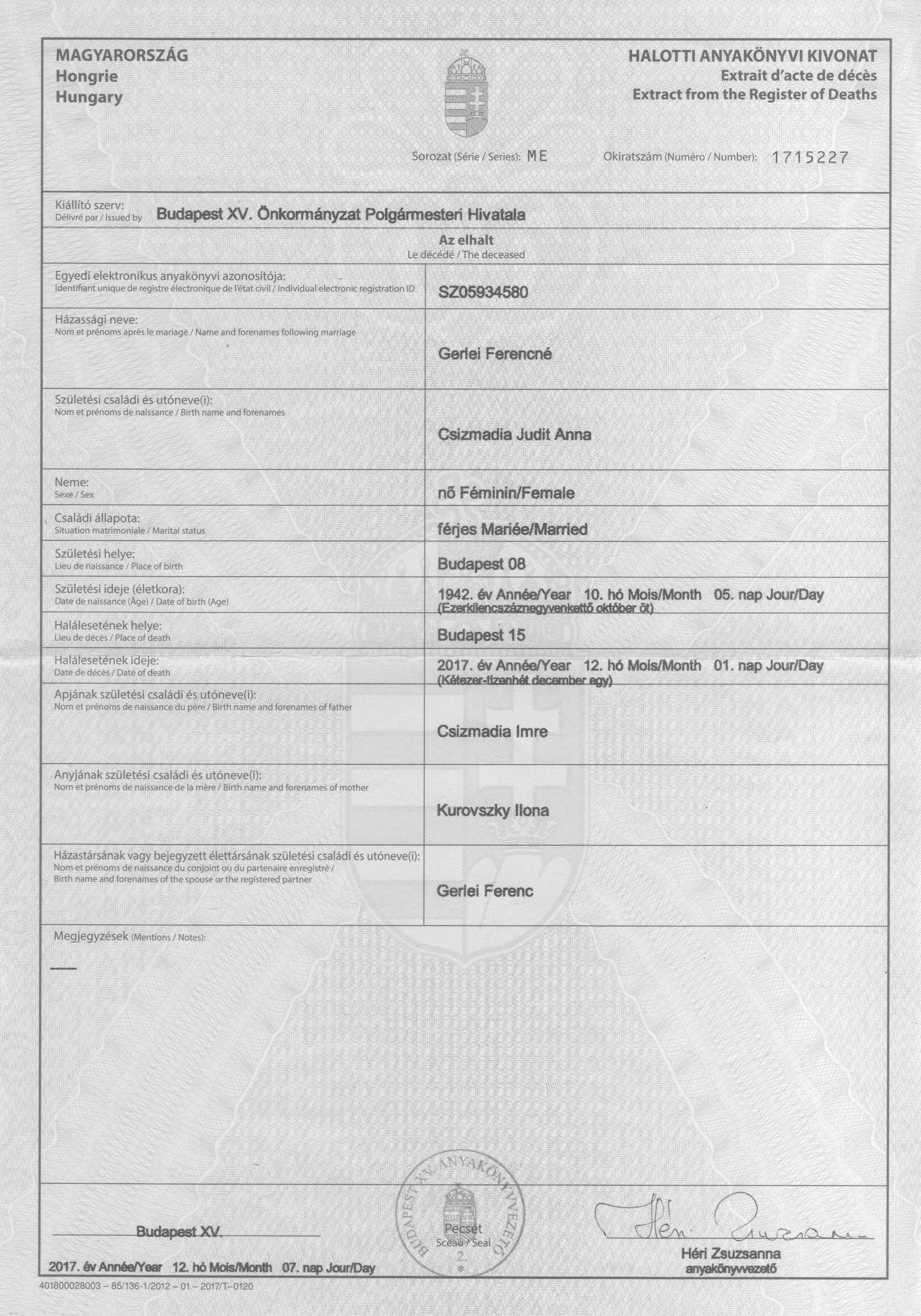 | Death | 2017-12-01 | Budapest, Magyarország | ||
