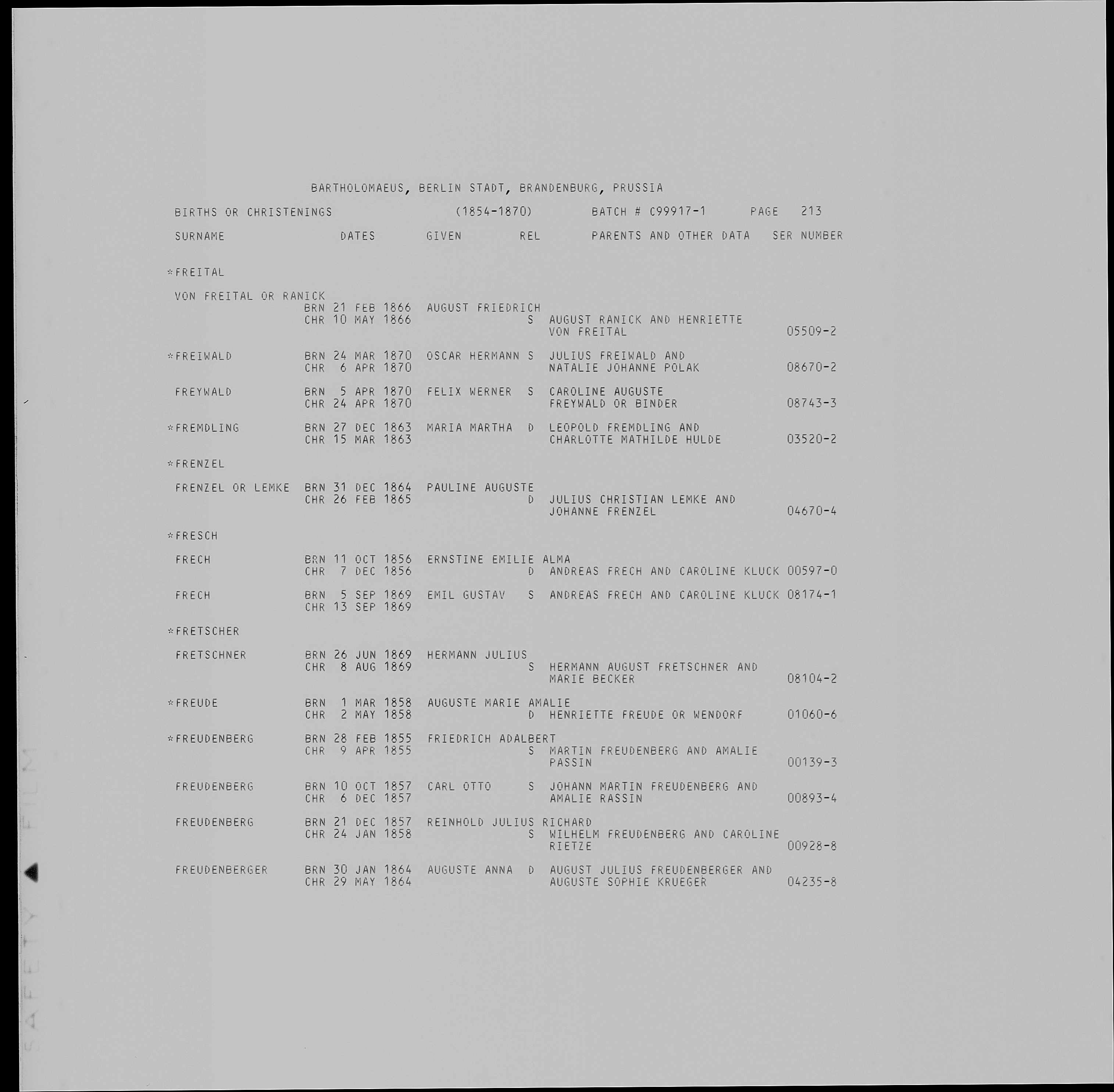 "Deutschland, ausgewählte evangelische Kirchenbücher 1500-1971," database, FamilySearch (https://familysearch.org/ark:/61903/1:1:QPK1-GBZZ : 26 October 2021), Oscar Hermann Freiwald, 6 Apr 1870; images digitized and records extracted by Ancestry; citing Baptism, Berlin, Brandenburg, Preußen, Berlin, German Lutheran Collection, various parishes, Germany.