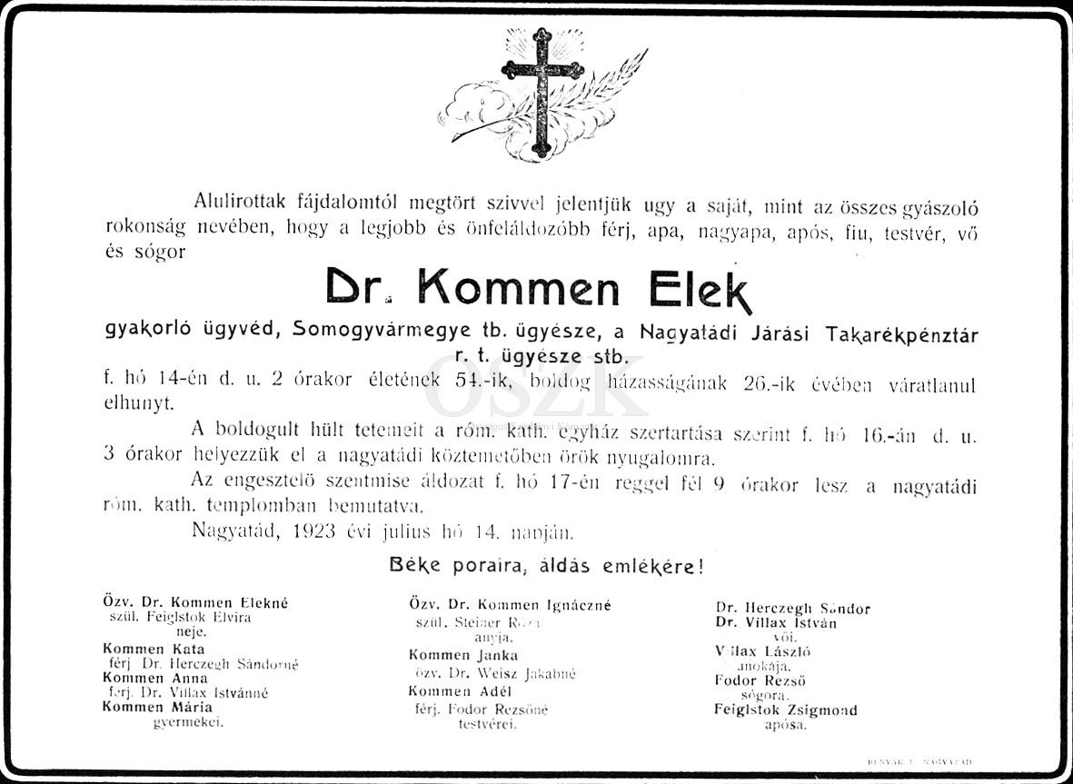 | Kommen Elek | 1868-11-19 | 1923-07-14 | ||