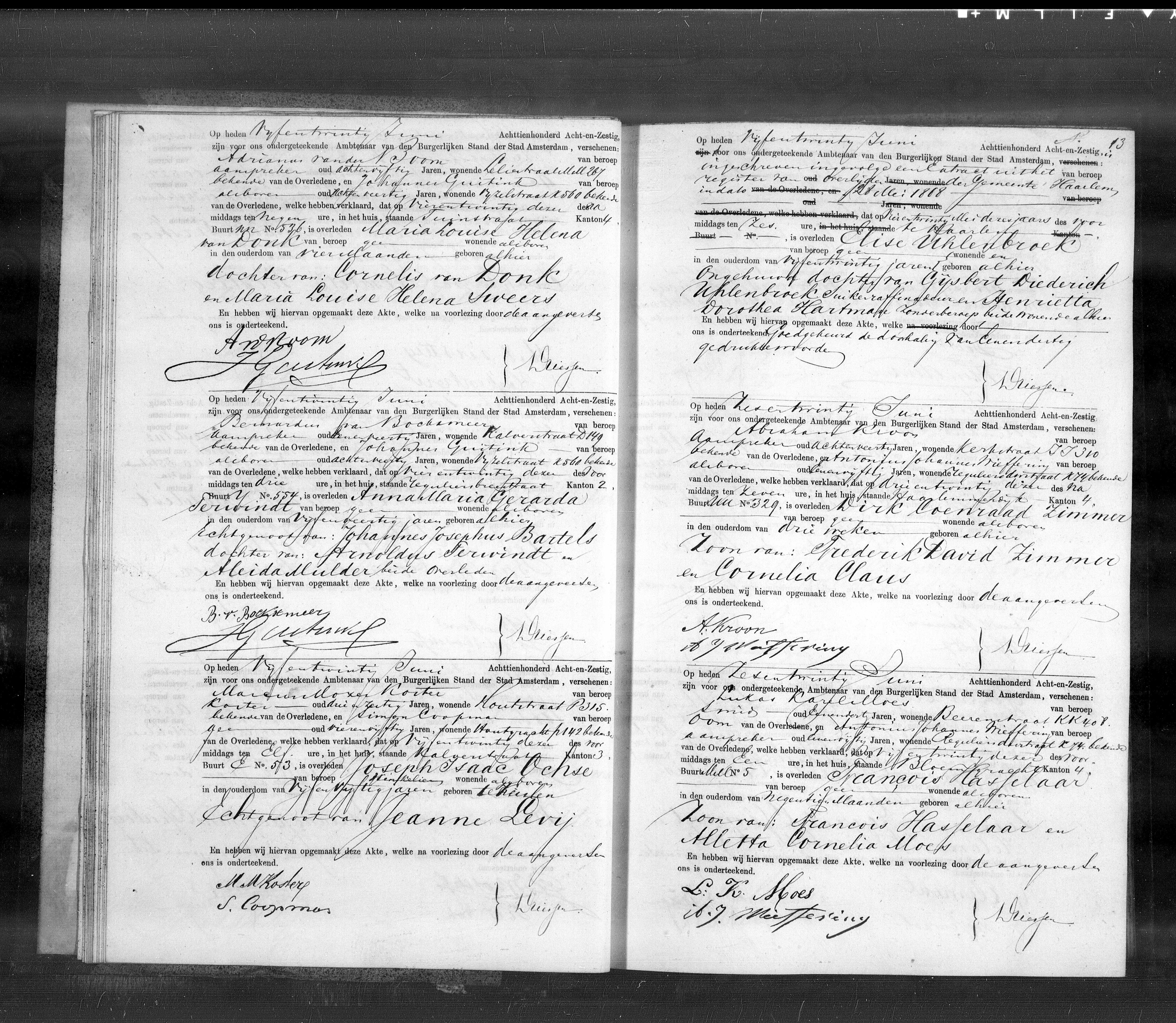 [Sterbeurkunde] Amsterdam 1868 Band 5, Seite 13, Joseph Isaac Ochse, +25.06.1868 Amsterdam, Winkelier, 55 Jahre alt, geboren in Köln, Ehemann von Jeanne Levy